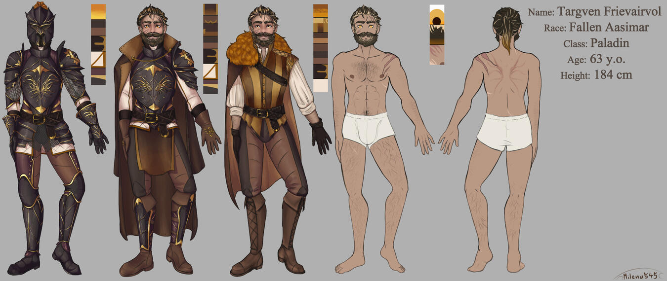 Front + Back view; color pallet; Basic info about character; Items (up to 3)Chibi